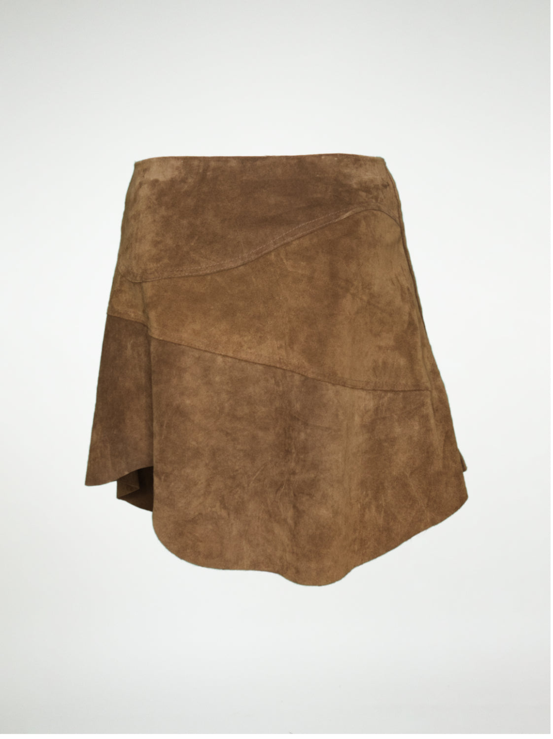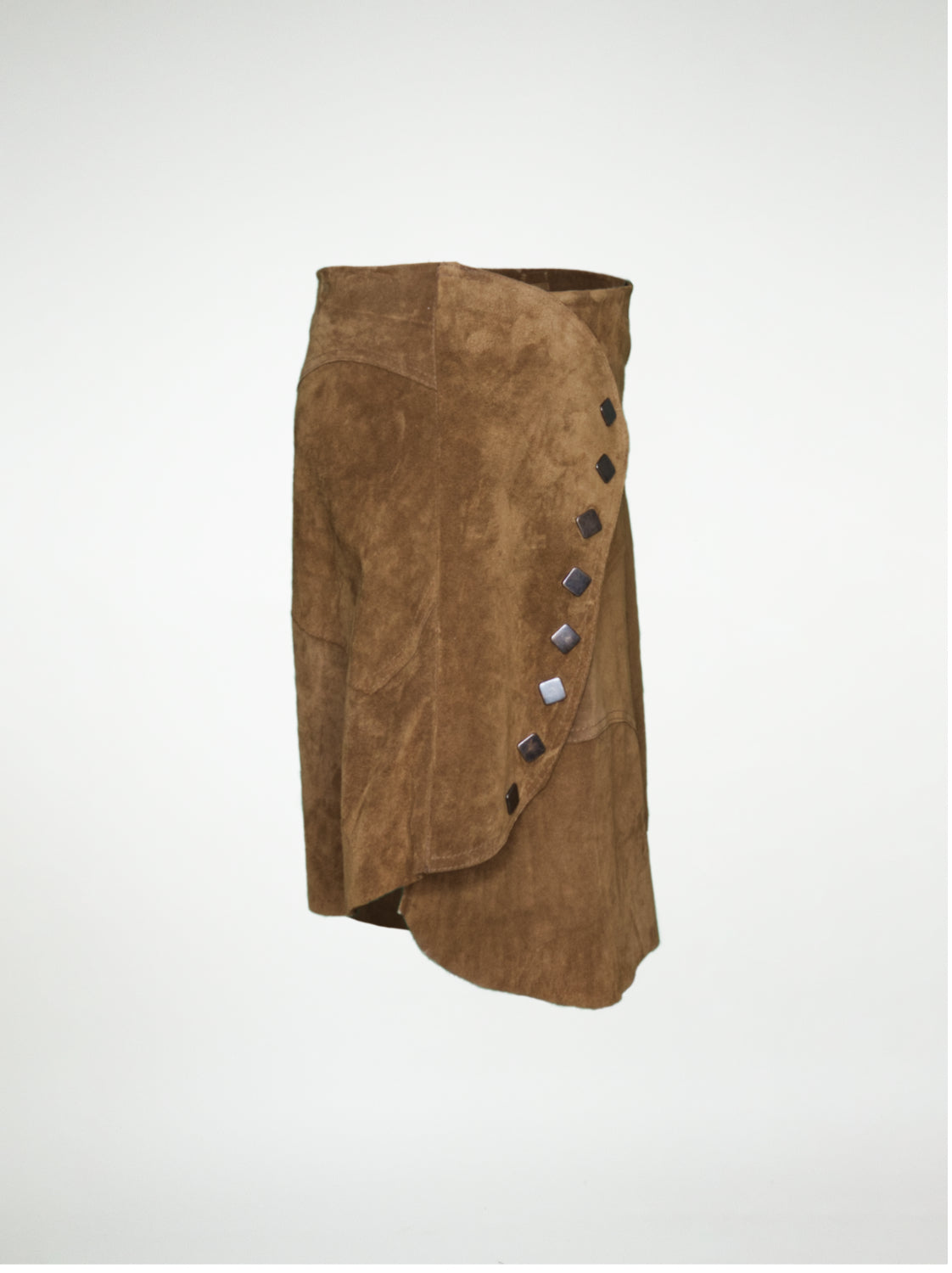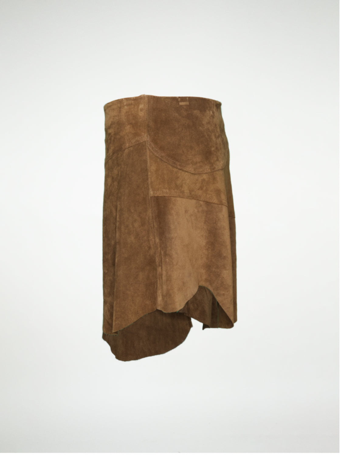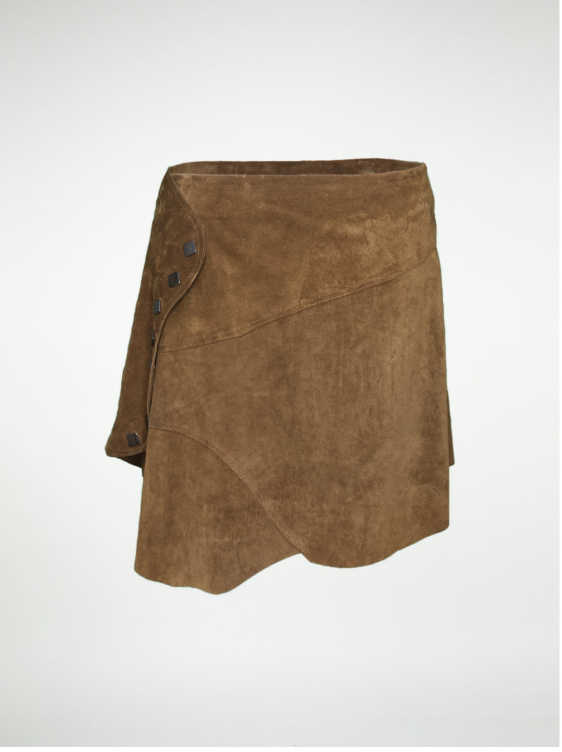 This skirt is made of a supple honey-suede leather and features an irregular raw-edge hem and vintage square snap closure.